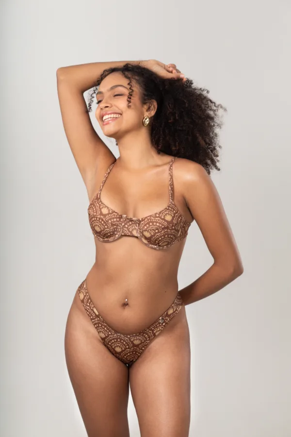 Biquíni Asa-Delta Mocha em estampa marrom, modelo mini franjado com bojo removível, acompanhado de calcinha asa-delta larga que valoriza as curvas com estilo.