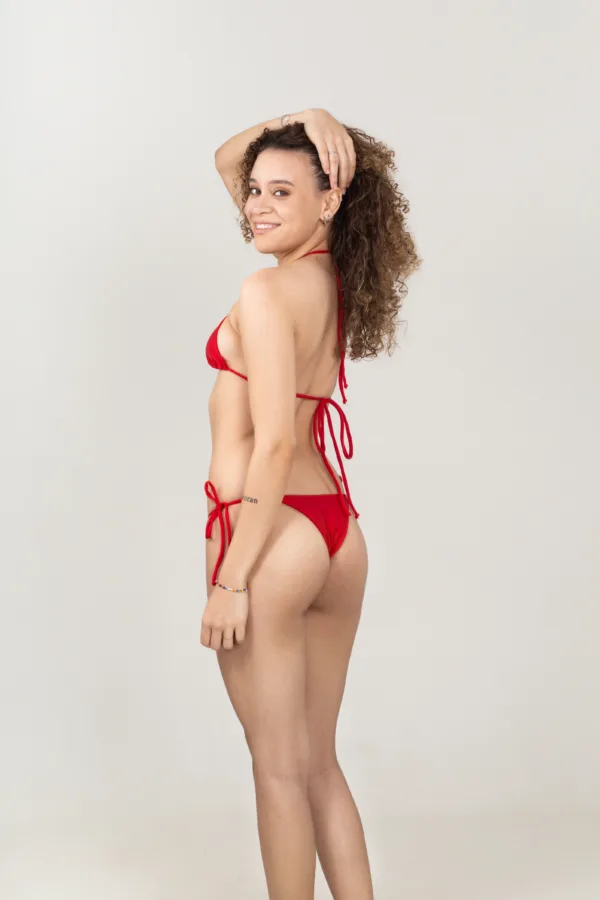Biquíni Búzios Vermelho um clássico indispensável. Modelo básico de marquinha com amarração em cima e embaixo, perfeito para garantir conforto, ajuste e estilo nos dias de sol.