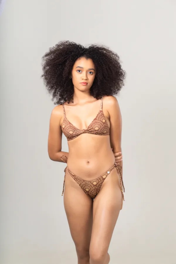Biquíni Nozinho Marrom Estampado charme e conforto em um só biquíni! Sem bojo, com nozinho frontal que valoriza a silhueta, calcinha asa delta de amarrar e tecido irisado que garante um toque sofisticado e elegante na praia ou piscina.