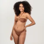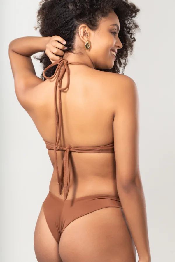 Biquíni Sol Asa Delta Marrom estilo e personalidade em um só look! Biquíni meia taça franjado com amarração no pescoço, detalhe frontal e calcinha asa delta, ideal para quem busca conforto e charme na praia ou piscina.