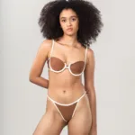 Biquíni Tropical Marrom Marfim com arco estruturado e franjado, sem bojo, detalhe em metal inoxidável nas costas e calcinha regulável, garante ajuste perfeito e estilo sofisticado para praia ou piscina.